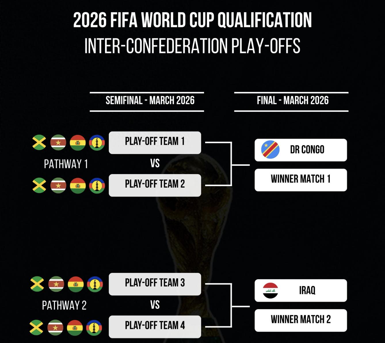 The rules of the intercontinental play-offs are that the two highest-ranked teams in the world among the six teams, Iraq (57) and Democratic Congo (60), will directly enter the finals to face the team that wins the semi-finals. The two North American qualifying play-off teams will be drawn and divided into different promotion paths. Jamaica is ranked 68th in the world. Their semi-final opponent will be Bolivia, which is ranked 76th in the world, or New Caledonia, which is ranked 150th. The opponent of Suriname, which is ranked 126th in the world, is the same.